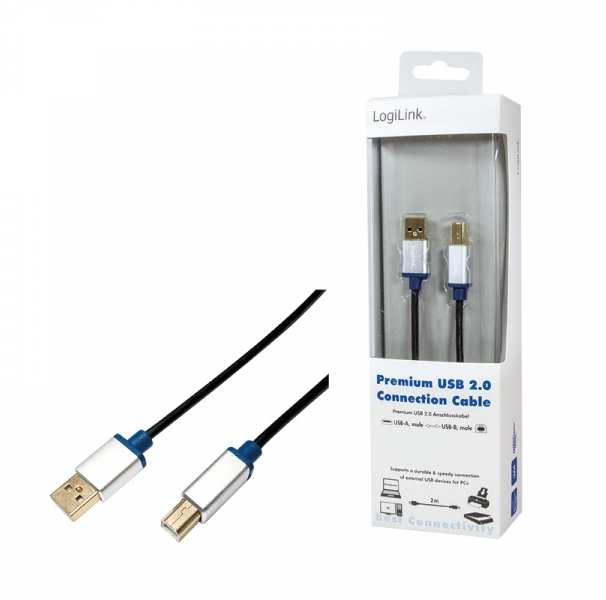 LogiLink 2m, USB2.0-A/USB2.0-B. Cable length 2 m, Connector 1 USB A, Connector 2 USB B, USB version 2.0, Connector gender Male connector / Male connector, Maximum data transfer rate 480 Mbit/s, Product colour Black