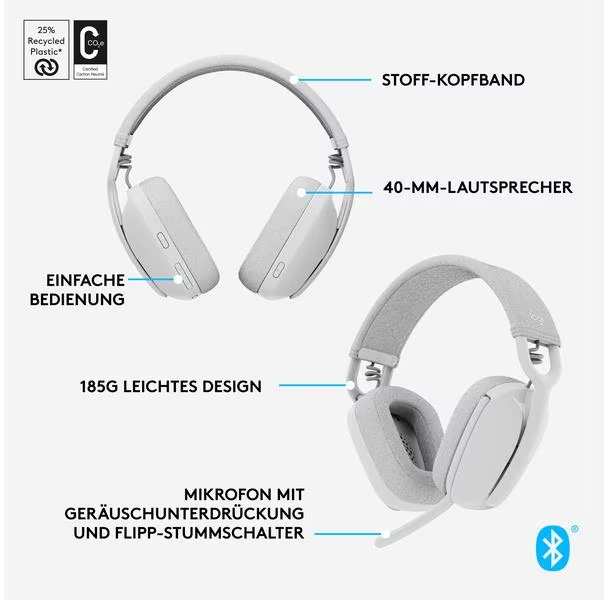 Logitech Headset Zone Vibe 100 White 981-001219. Wireless office headset with a lightweight and comfortable design. Wireless connection via Bluetooth (range up to 30 m). Two omnidirectional MEMS microphones with directional beamforming and DSP, 40mm speakers for crystal clear playback.Lightweight and modern design with on-ear controls. Up to 18 hours of battery life (speaking) or 20 hours of battery life (listening). Includes travel case for comfortable transport.