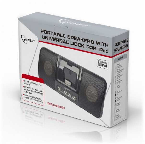 KenmerkenPassend für iPod Nano, iPod Touch, iPod Classic, iPod Video 30G, iPod Shuffle, iPhone 3/4/5/6 und andereKann über den Stromanschluss oder mit Batterien betrieben werdenLäd im Netzbetrieb den Akku des iPodsIntegrierter Digitaler VerstärkerLautstärkeregler, 3D Sound-Taste und AudioeingangSpecificatiesLeistung 3 W RMSFrequenzbereich 120 - 20000 HzStromversorgung Netzteil oder 4 x AAA Batterien (nicht im Lieferumfang)Abmessungen 220 x 60 x 87 mmInhoudLautsprecherKunststoffhalterungen für unterschiedliche iPod-Modelle (5 Stück)NetzkabelKabel mit 3,5 mm Klinkenanschluss (1 m)Adapter for iPhone 5 seriesAdapter for iPhone 6 series