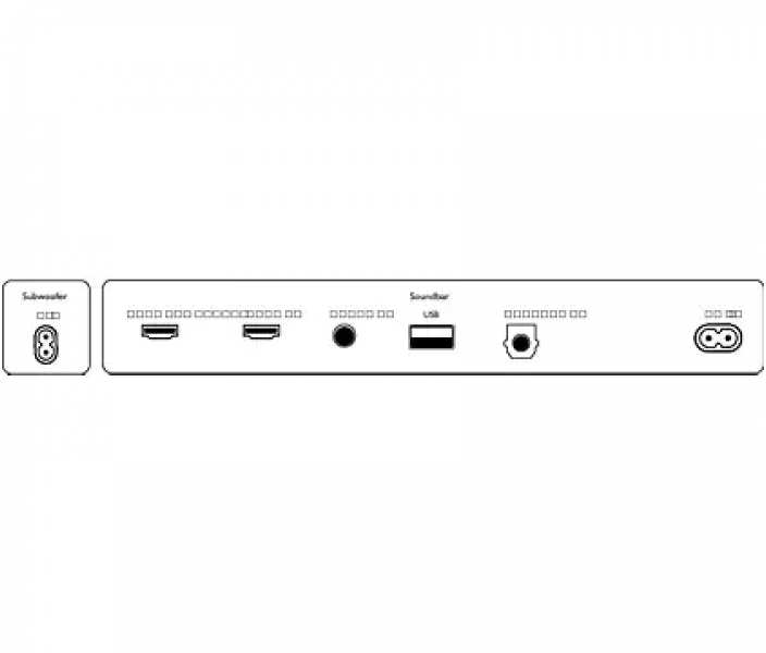 Sound quality improvement treble and bass control, audio sync Equalizer settings Movie, Music, Voice, Stadium, Customized Total harmonic distortion 10% Speaker system output power Max. 600W/300W RMS Surround mode UPMIX, Standard, AI Speakers Subwoofer frequency range 35-150 Hz Subwoofer type Active wireless subwoofer Subwoofer impedance 3 ohms Number of audio channels 3.1 Number of woofers 1 Woofer diameter 6.5 (165 mm) Soundbar frequency range 150 to 20,000 Hz Impedance soundbar 6 x 8 ohms Medium Drivers 2 Full Range Front Drivers 2 Full Range (L+R), 2 Tweeters (L+R) External subwoofer housing bass reflex