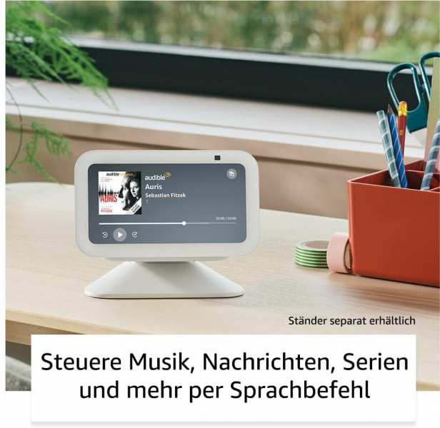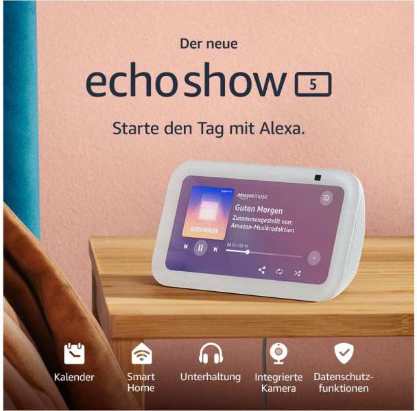 Amazon Echo Show 5 (3 gen.). Virtual assistant Amazon Alexa, Shape Rectangle, Product colour White. Display diagonal 14 cm (5.5), Processor manufacturer MediaTek, Camera resolution (numeric) 2 MP. Driver diameter 4.4 cm, Volume control Buttons, Music apps Amazon Music, Deezer, Spotify. Connectivity technology Wireless, Wi-Fi standards 802.11a, 802.11b, 802.11g, Wi-Fi 4 (802.11n), Wi-Fi 5 (802.11ac), Wi-Fi band Dual-band (2.4 GHz / 5 GHz). Power source type DC, Power consumption (typical) 21 W