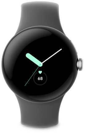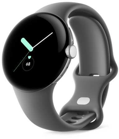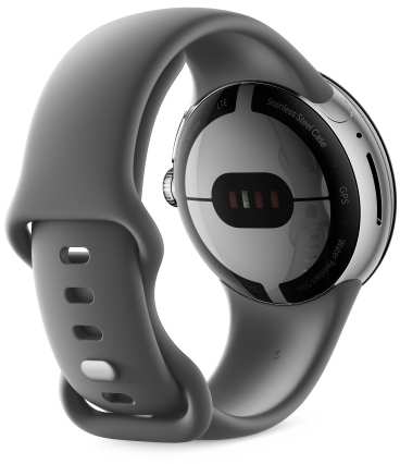 Google Pixel Watch. Display technology AMOLED. RAM capacity 2000 MB, Flash memory 32 GB. Wi-Fi. GPS (satellite). Battery capacity 294 mAh. Band material Fluoroelastomer, Band colour Grey, Band size S/L. Operating system installed Wear OS