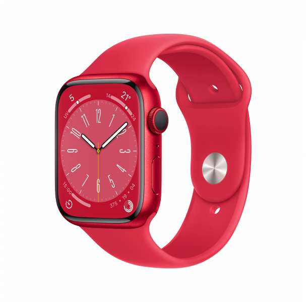 Apple Watch Series 8. Display technology OLED, Display resolution 352 x 430 pixels, Touchscreen. Flash memory 32 GB. Wi-Fi. GPS (satellite). Weight 32 g. Waterproof up to 50 m, Band colour Red. Operating system installed watchOS 9