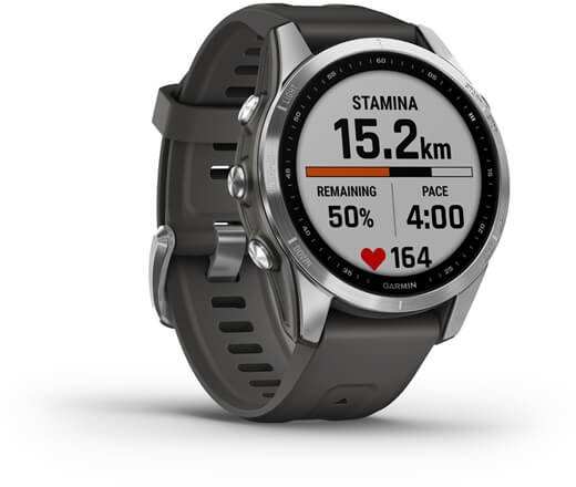Garmin fenix 7S. Display diagonal 3.05 cm (1.2), Display technology MIP, Display resolution 240 x 240 pixels, Touchscreen. Flash memory 16 GB. Wi-Fi. GPS (satellite). Weight 63 g. Band material Silicone, Band colour Graphite