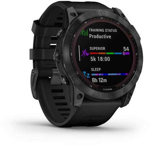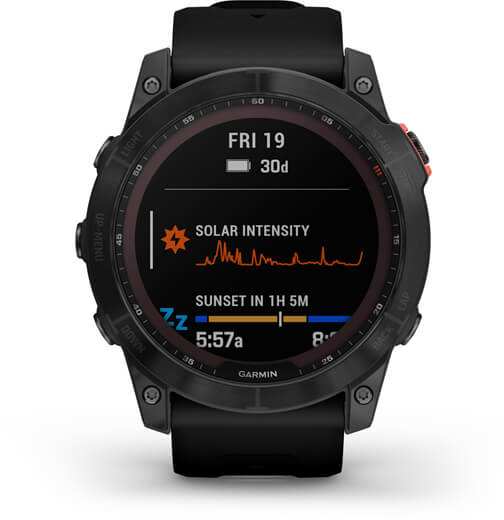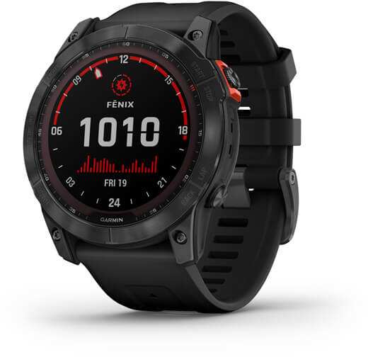 Garmin fenix 7X Solar. Display diagonal 3.56 cm (1.4), Display technology MIP, Display resolution 280 x 280 pixels, Touchscreen. Flash memory 16 GB. Wi-Fi. GPS (satellite). Weight 96 g. Band material Silicone, Band colour Black