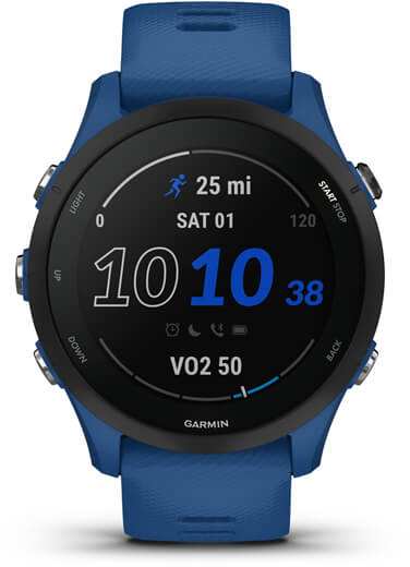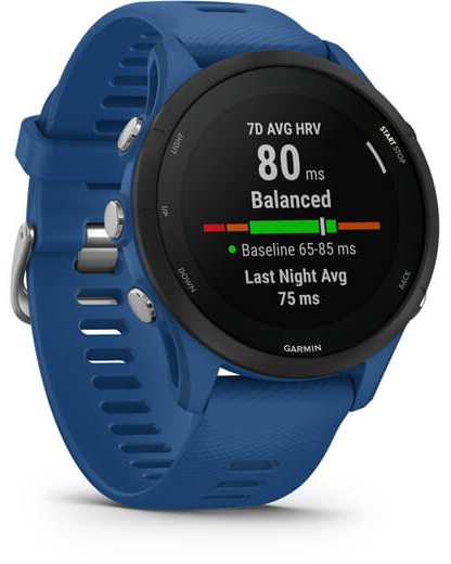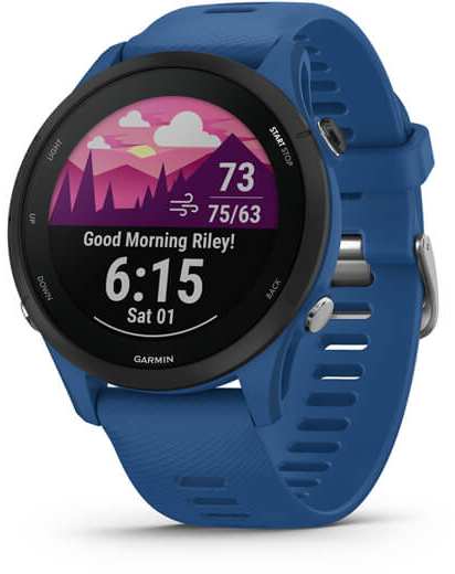 Garmin Forerunner 255. Display diagonal 3.3 cm (1.3), Display technology MIP, Display resolution 260 x 260 pixels, Touchscreen. Flash memory 4 GB. Wi-Fi. GPS (satellite). Weight 49 g. Band material Silicone, Band colour Blue, Band size One Size