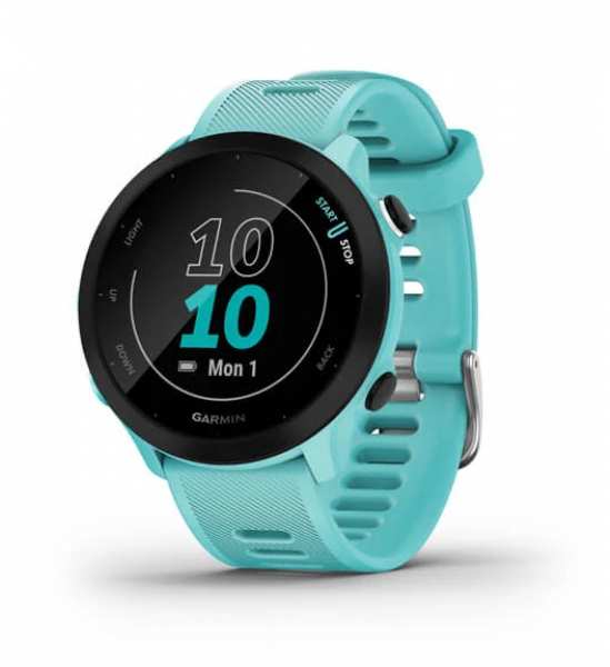 Garmin Forerunner 55. Display diagonal 2.64 cm (1.04), Display technology MIP, Display resolution 208 x 208 pixels. GPS (satellite). Weight 37 g. Band material Silicone, Band colour Turquoise