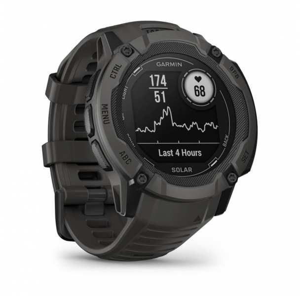 Garmin Instinct 2X Solar. Display diagonal 2.79 cm (1.1), Display technology MIP, Display resolution 176 x 176 pixels, Touchscreen. GPS (satellite). Weight 67 g. Band material Silicone, Band colour Graphite, Band size One Size