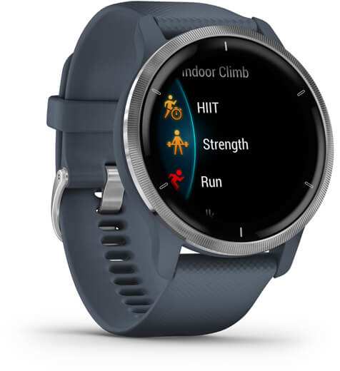 Garmin Venu 2. Display diagonal 3.3 cm (1.3), Display type AMOLED, Display resolution 416 x 416 pixels, Touchscreen. Wi-Fi. GPS (satellite). Weight 49 g. Band material Silicone, Band colour BlueGranitblau/Silber mit Schnellwechsel-Silikon-Armband 22mm