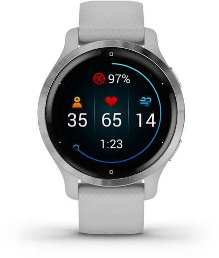 Garmin Venu 2S. Display diagonal 2.79 cm (1.1), Display technology AMOLED, Display resolution 360 x 360 pixels, Touchscreen. Wi-Fi. GPS (satellite). Weight 38.2 g. Band material Silicone, Band colour Silver