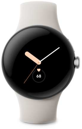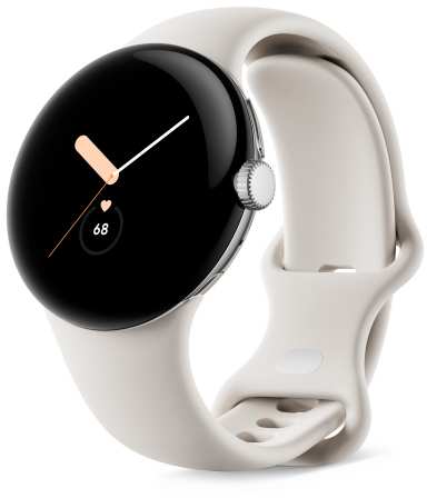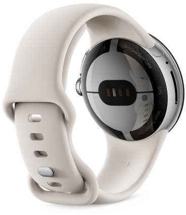 Google Pixel Watch. Display technology AMOLED. RAM capacity 2000 MB, Flash memory 32 GB. Wi-Fi. GPS (satellite). Battery capacity 294 mAh. Band material Fluoroelastomer, Band colour White, Band size S/L. Operating system installed Wear OS