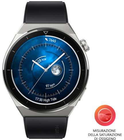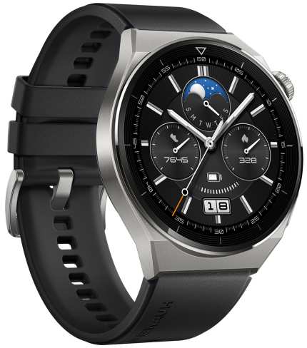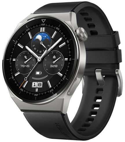 Huawei WATCH GT 3 Pro. Display diagonal 3.63 cm (1.43), Display technology AMOLED, Display resolution 466 x 466 pixels, Touchscreen. GPS (satellite). Battery capacity 530 mAh. Weight 71.9 g. Waterproof up to 30 m, Band material Fluoroelastomer, Band colour Black. Operating system installed HarmonyOS