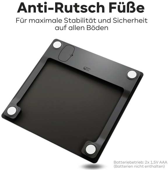 Electronic personal scales with easy-to-read, high-quality LCD display Unit of measurement in kg, lb, st (switchable) Measuring range from 5-180kg in 100g increments Step-on automatic Extra large, high-quality and easy-care glass surface approx. 30 x 30 cm (hygienic and scratch-resistant) Automatic shutdown increases battery life Secure stand thanks to anti-slip feet Battery change indicator Battery operation 2x 1.5 V AAA (batteries not included)