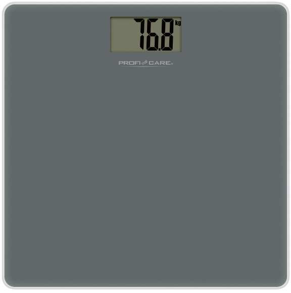ProfiCare glass personal scales grey. Provides an accurate and reliable way to monitor your weight. With its high-quality LCD display, it is easy to read and you can switch the unit of measurement according to your preference - be it kilograms, pounds or stones. With a generous measuring range of 5 to 180 kg in 100 g increments, this digital scale is suitable for all family members.