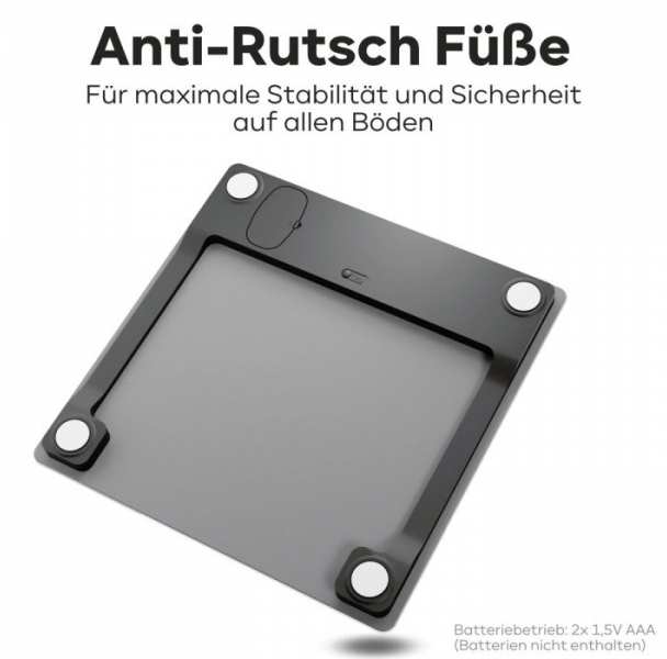 Electronic personal scales with easy-to-read, high-quality LCD display Unit of measurement in kg, lb, st (switchable) Measuring range from 5-180kg in 100g increments Step-on automatic Extra large, high-quality and easy-care glass surface approx. 30 x 30 cm (hygienic and scratch-resistant) Automatic shutdown increases battery life Secure stand thanks to anti-slip feet Battery change indicator Battery operation 2x 1.5 V AAA (batteries not included)