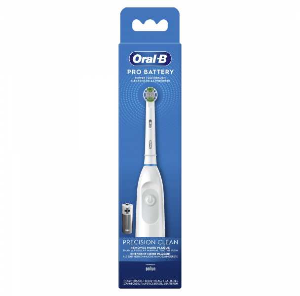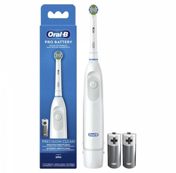 Oral-B Pro Battery. Purpose Adult, Product colour White, Handle colour White. Power source Battery, Battery type AA, Battery technology Alkaline. Number of handles included 1 pc(s), Number of brush heads included 1 pc(s), Number of batteries included 2 pc(s)