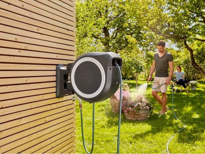 The RollUp XL wall-mounted hose box makes watering a large garden easy and pleasant. You mount the compact hose storage permanently on your house wall and connect it to the water tap with a connecting hose. Thanks to the 35 metre long hose and the 180° swiveling hose box, watering your plants is made much easier.