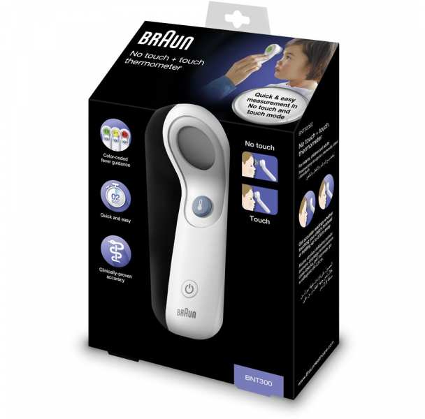 Braun BNT300WE. Type Remote sensing thermometer, Product colour White, Thermometer location Forehead. Battery type AA. Width 135 mm, Depth 62 mm, Height 250 mm