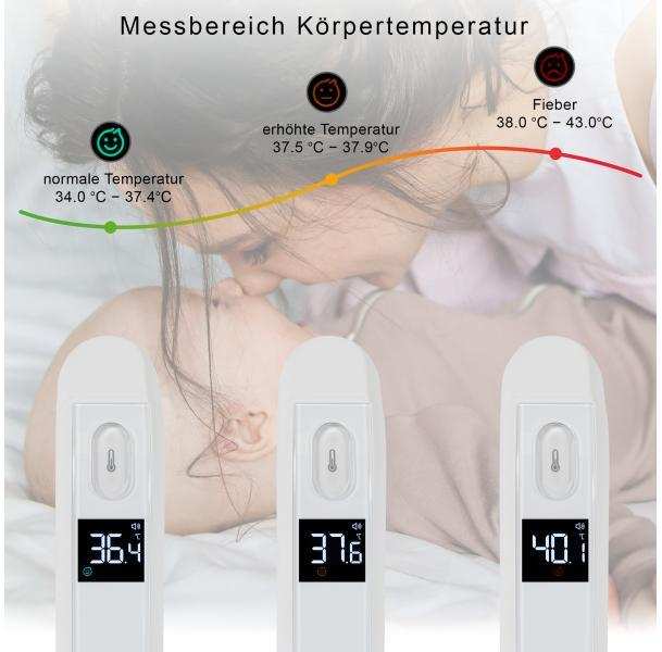 Forehead thermometer for contactless and hygienic measurement of body temperature Suitable for babies, toddlers and adults 3-colour LCD fever light - green normal temperature (34.0 °C-37.4 °C) - orange elevated temperature (37.5 °C-37.9 °C) - red fever (38.0 °C-43.0 °C) Illuminated LCD display (easy to read) - ideal for taking readings during sleep/dark Acoustic end signal Silent mode - beep can be switched off for measuring during sleep without disturbing the baby or toddler during sleep Display for Fever measurement, 3-colour fever light (normal temperature, elevated temperature, fever), Celsius, Fahrenheit, signal tone (on/off), battery change Infrared measuring technology (contactless and hygienic) Measuring range body temperature 34.0 °C-43.0 °C Simple 1-button operation Precise measurement of body temperature in °C and °F Measurement result in 1 second Automatic switch-off of the measuring function (after approx. 10 sec.), increases battery life Battery change indicator in the display Easy cleaning Battery operation 2x 1.5 V AAA