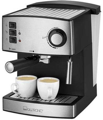 Espresso and cappuccino pump machine Stainless steel front Swivelling stainless steel steam nozzle with foaming and hot water function Steam volume steplessly adjustable Steam nozzle tip removable for easy cleaning Cup warming function with stainless steel insert Constant pump pressure of 15 bar 1.6 litre transparent water tank (detachable) External water level gauge Collection cup with stainless steel drip grid (removable) 2 pilot lamps Automatic shut-off Operational readiness indication Accessories 2 filter holders (1 and 2 cups), coffee scoop, tamper 230 V, 50 Hz, 850 W Cups not included in the scope of delivery