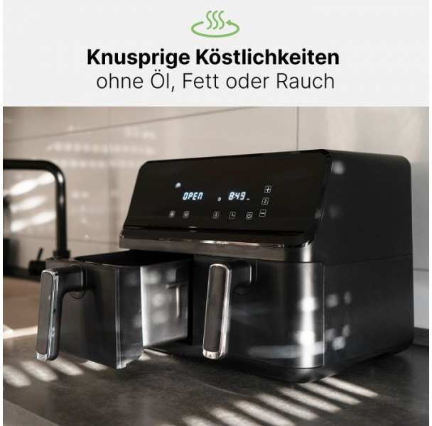 With a capacity of 8.0 liters and two separate containers, our hot air fryer offers space for all your culinary ideas - double the joy, double the tasteOur large deep fryer enables fat-free frying so you can enjoy crispy delicacies without the unwanted oil - health meets tasteThanks to the two separate frying containers and the individual controls, you can prepare different dishes at the same time without the flavors mixing - develop your creativityWith 8 automatic programs, a variable defrost/keep warm function and the Just In Time system, preparing your favorite dishes is child's play - perfect timing for your mealsOur hot air fryer not only shines in the kitchen, but also with cool touch handles, sensor touch controls and non-stick coating - enjoy delicious dishes with ease and safety