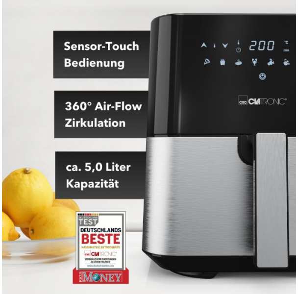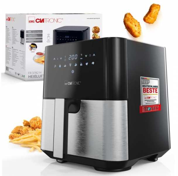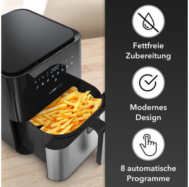 Genießen Sie Öl- und fettfreies Frittieren mit der Clatronic® Heißluftfritteuse. Dank der XXL-Kapazität von 5 Litern können Sie gleich leckere Pommes, Nuggets oder Fisch für die ganze Familie zubereiten. Verleihen Sie Ihrer Küche eine edle Note durch die Edelstahlfront. Mit den 8 Automatikprogrammen inkl. individueller Zeit-/Temperatureinstellung ist es einfacher denn je, Ihre Lieblingsgerichte zuzubereiten. Verabschieden Sie sich von lästiger Rauch- und Geruchsentwicklung. Die Heißluftfritteuse HL 3782 H von Clatronic® bietet zeit- und energiesparende Zubereitungsmethoden. Der Cool Touch-Griff und das LED-Display mit Sensor Touch-Bedienung machen die Bedienung einfach und sicherDank Antihaftbeschichtung und stufenlos regelbarem Thermostat (80°C200°C) können Sie immer die perfekte Temperatur für Ihre Gerichte einstellen. Mit Abschaltautomatik und Überhitzungsschutz können Sie sich auf eine sichere Nutzung verlassen.