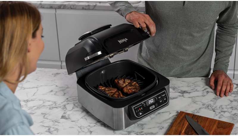 Ninja AG301. Product type Hot air fryer, Capacity 5.7 L, Fryer food capacity 1 kg. Construction type Single, Product colour Black, Control type Buttons. Power 1750 W. Width 450 mm, Depth 360 mm, Height 240 mm. Packaging content Ceramic-Coated Cooking Pot Splatter Guard Cleaning Brush with Scraper