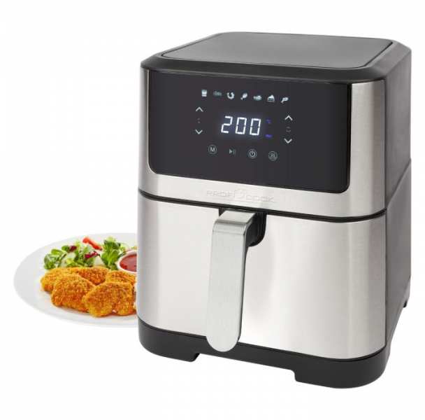Capacity approx. 8 liters Oil and fat-free hot air fryer Programs/Functions 7 automatic programs Variable defrost/keep warm function Individual time/temperature setting Low smoke and odor development Time and energy saving preparation Cool touch handle LED display with sensor touch operation Non-stick coated container Continuously adjustable thermostat (80 °C - 200 °C) Automatic switch-off Overheating protection 220-240V, 50-60Hz, 1800W