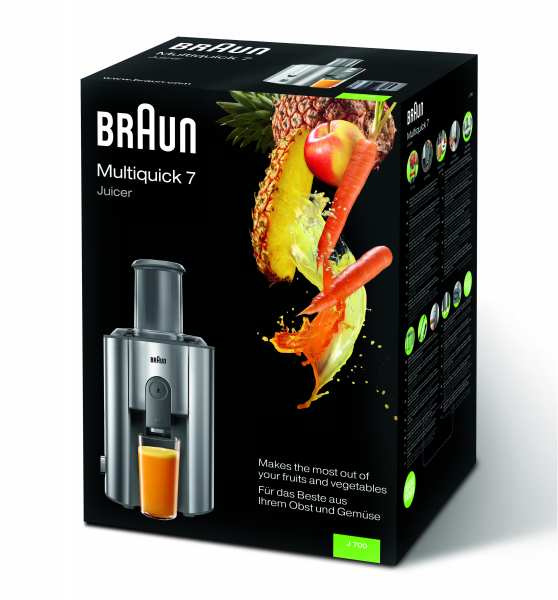 Braun Multiquick 7 juicer J 700. Product type Centrifugal juicer, Product colour Stainless steel, Pulp container capacity 2 L. Housing material Stainless steel. Power 1000 W. Width 270 mm, Depth 380 mm, Height 510 mm. Package width 510 mm, Package depth 380 mm, Package weight 6.48 kg