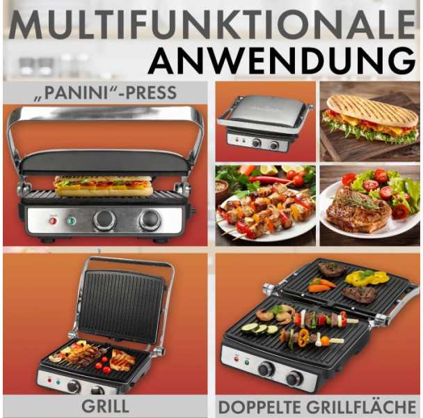 Contact grill for fat-free grilling on both sides. Non-stick coated grill plates with extra deep grooves for an intensive grill pattern and optimal fat drainage and central fat drainage channel and drip tray. Grill plates can be removed for easy cleaning + versatile use for e.g. B. Panini, steaks, fish, vegetables, eggs or desserts.