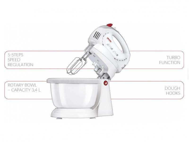 5 speed steps + turbo function Agitator release button Paddle safety device to prevent accidental removal of paddles Rotating mixing bowl with a capacity of 2.4 litres Whisk attachments for whipping liquids eggs Hook mixer for kneading dough Power supply 220-240 V 50/60 Hz Power 300 W