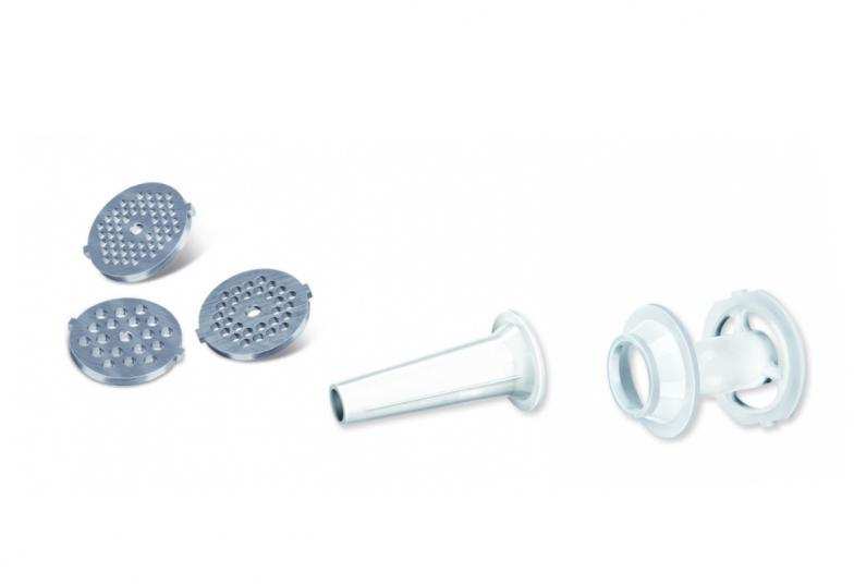 REVERSE function Metal grinding chamber with push-button release Easy to dismantle Anti-slip feet Feed chute Stainless steel blades 3 sieves with holes 3, 5, 7 mm Slot for making sausages Slot for making pies Pusher Power supply 220-240 V 50 Hz Maximum power 720 W