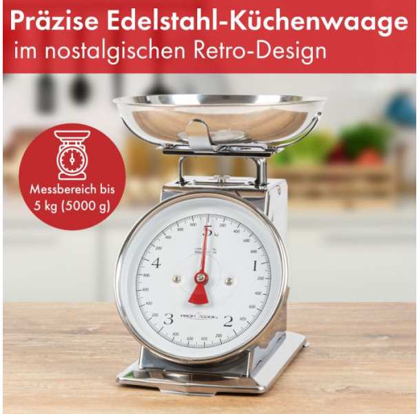 Die ProfiCook Küchenwaage im stilvollen Retro-Design funktioniert mechanisch und eignet sich durch die mitgelieferte Wiegeschale perfekt zum präzisen Wiegen und Messen von Lebensmitteln und Zutaten. Die analoge Anzeige der Waage zeigt Gewicht bis zu 5 kg an. Durch das große Ziffernblatt können die Einheiten besonders gut abgelesen werden. Die Tara-Funktion der Haushaltswaage ermöglicht einfaches Zuwiegen von Zutaten. Die stilvolle Küchenwaage funktioniert ohne Batterie und Strom und hat einen festen Stand, wodurch sie überall in der Küche platziert werden kann. Durch ihr ausgefallenes Design ist die Grammwaage das perfekte Küchenzubehör und fungiert gleichzeitig als Küchen-Deko. Die mitgelieferte Edelstahl Wiegeschale ist abnehmbar und ermöglicht direktes abmessen in der Schale. So kann die Schüssel bequem befüllt und entleert werden. Die Waage analog ist durch sein großes, gut ablesbares Ziffernblatt das perfekte Geschenk für Senioren oder für Retro-Fans.
