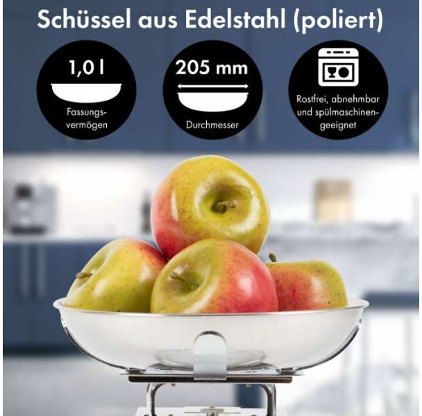 Precise stainless steel kitchen scale in nostalgic retro design Stainless steel housing and bowl (polished)vSuitable for weighing ingredients e. g. in restaurants and bakeries Bowl with approx. 1.0 litre capacity (stainless, removable and dishwasher-safe) Large and easy to read analogue scale Solid weighing mechanism Measurement range up to 5 kilogram / 5000 gram Tare function (additive weighing function) Secure stand No batteries or power supply necessary