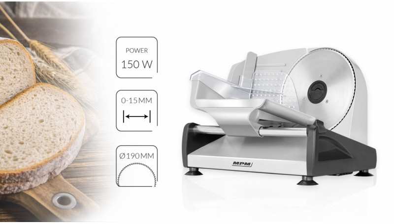 Smooth adjustment of the cutting thicknessin the range of 0-15 mm Removable stainless steel knife190 mm in diameter Stainless steel trolley Removable interlock guide Pinch tray Easy cleaning Rubber anti-slip feet