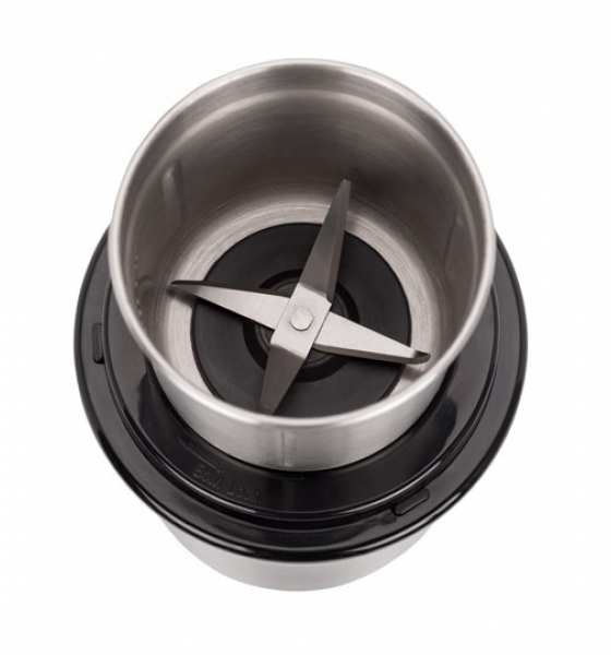 Housing made of stainless steel Pulsating (percussive) grinding option Transparent lid Space for winding the power cord Start-up protection without the lid Rubber non-slip feet Two stainless steel containers with a capacity of 70 g For grinding coffee with 2 stainless steel blades For grinding e.g. cereals, herbs and nuts with 4 stainless steel blades Power supply 230 V, 50/60 Hz Power 200 W