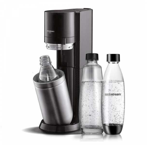 SodaStream DUO black. Product colour Black, Stainless steel, Bottle material Glass. Carbonating bottle volume 1 L, Carbonator charger capacity 60 L. Width 155 mm, Depth 280 mm, Height 440 mm. Package type Box