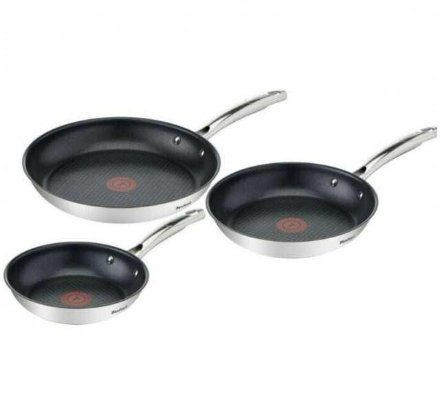 Tefal Duetto+ G732S334. Product colour Black, Stainless steel, Material Stainless steel, Internal coating Titanium. Frying pan diameter 20 cm, Frying pan 2 diameter 24 cm, Frying pan 3 diameter 28 cm. Number of products included 3 pc(s), Number of frying pans 3 pc(s)