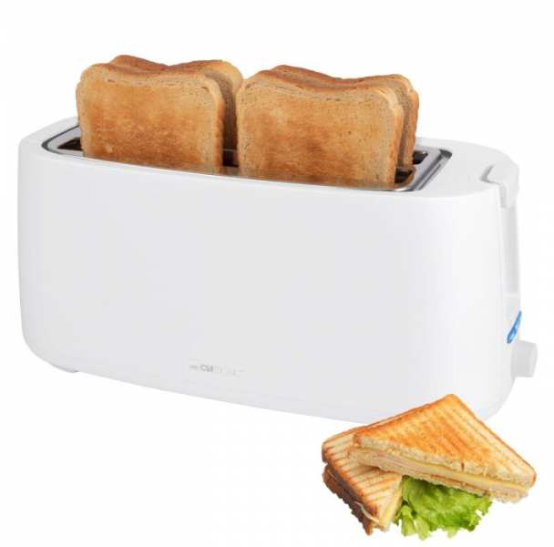 Clatronic Toaster TA 3802 white. With the 4-slice toaster from Clatronic you can conjure up delicious, golden-brown toast and treat yourself or your loved ones every morning. Enjoy not only crispy toast, but also trendy toast rolls and tasty ready-made waffles - for varied breakfasts full of enjoyment. The Cool Touch housing ensures that you never burn your fingers, even when the toaster is in full operation. With the infinitely adjustable browning level function, you can brown your toast exactly according to your preferences - from lightly browned to crispy golden brownThe defrost, reheat and quick stop functions as well as the automatic and manual shut-off make this toaster an indispensable helper in the kitchen.