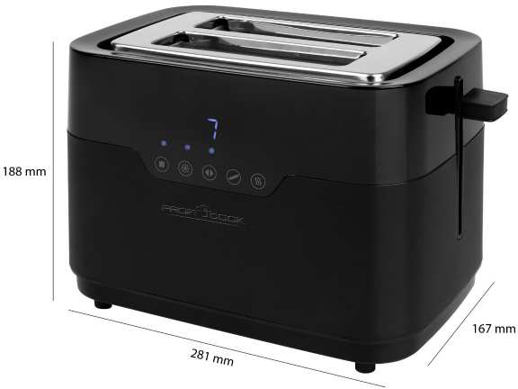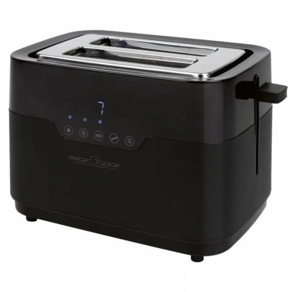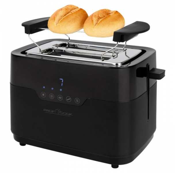 ProfiCook PC-TA 1244 toaster stainless steel matt black with bread roll attachment for 2 slices of toast with extra wide toast slots, sensor touch operation including blue illuminated LED display. Wide Slot - The toaster has extra wide toast slots (40mm) for thick and thin slices of toast, also perfect for bagels, flatbread, baguettes and even waffles. Thanks to seven easy-to-adjust browning levels, you can toast your toast exactly how you want it. With the centering function, your toast will be evenly browned. The included and detachable roll attachment made of stainless steel is perfect for baking and defrosting rolls, baguettes and much more. Thanks to the integrated crumb tray, crumbs can be easily removed from the toast. The different programs defrosting/warming up/quick stop/bagel and baguette function can be set individually and easily via the sensor touch display (illuminated in blue).