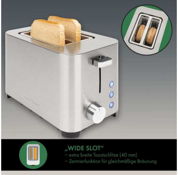 2-slice toaster Stainless steel housing Wide slot extra wide toast slots (40 mm) for e. g. bagels, toast rolls Bread roll attachment (removable) Defrost/reheat/quick-stop function (illuminated) Continuously adjustable browning level Incl. browning level display Centring function for even browning Automatic and manual switch-off Crumb drawer Cord storage Secure stand due to rubberized feet 220240 V, 50/60 Hz, 750850 W