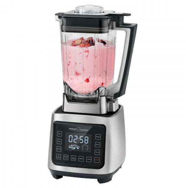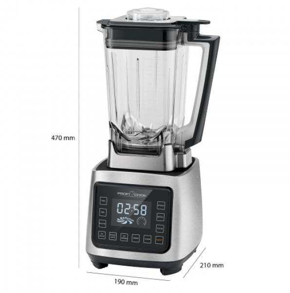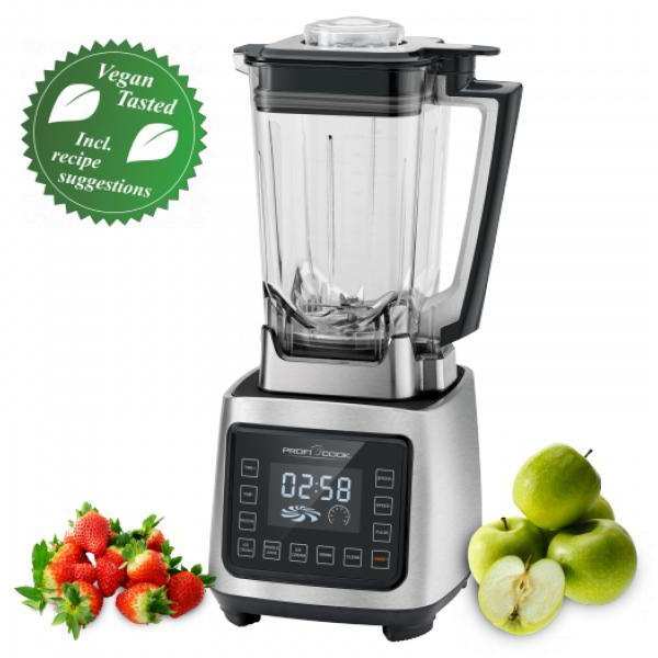 Robust professional mixer/smoothie maker with aluminium die-cast housing for pureeing, beating, chopping up, shaking, mixing Fruit and especially green vegetable juices prepared quickly and freshly. Rich in essential minerals for well-being, fitness and health Mix and puree fruits and vegetables in seconds without crushing, also well suited for soups Ideal for the preparation of vegan recipes quick and fine shredding of the mixture like leaf green for healthy, easily digested and wholesome Food Powerful long-life professional motor (2000 W) for high speeds and a flexible speed range Electronic High-quality multifunctional Display Electronic sensor touch control panel with multifunctional display for easy Operation 9 functions timer function, smoothie function (ideal for green smoothies), ice crush function, start/stop function, shake function, chop function (grinding/crushing), cleaning function, pulse function, Speed Electronic speed control (8 speed levels) Removable XL mixing bowl made of tritan (BPA free) with scale (2.0 litre) Lid with refill opening (approx. 50 mm Ø) Robust, specially ground 8-fold stainless steel cross knife for mixing/pureeing without Problems High stability due to rubberized feet Incl. recipe suggestions 220240 V, 50/60 Hz, 2000 W CE ZeichenTÜV Rheinland Geprüfte Sicherheit