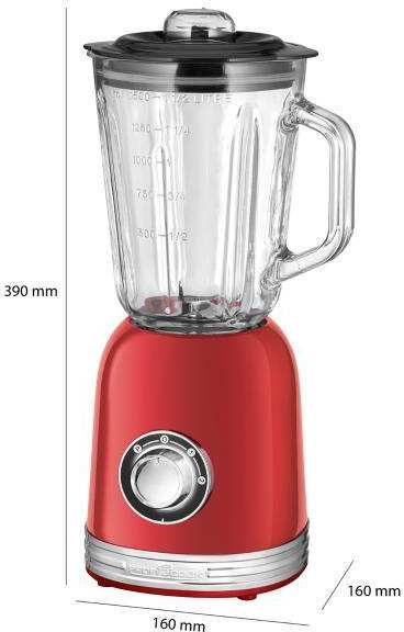 Solid metal housing & high quality chrome applications Powerful long-life professional motor (800 watts) Ice crush and turbo function 4 speed levels (0-1-2 + pulse/turbo function) Removable solid glass mixing container with scale (1.5 liters) Lid with refill opening (approx. 50 mm Ø) Cover for refill opening can be used as a measuring cup (5 cl) 4-way stainless steel knife with Piranha cut Rotary switch (illuminated) Safety circuit Operation only possible with the container on Safe stand thanks to suction feet 220-240 V, 50/60 Hz, 800 W, 18,000 rpm. Max.