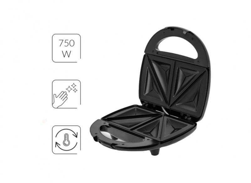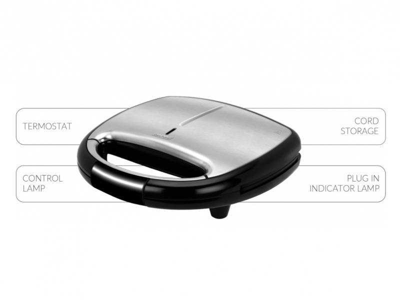Stainless steel housing For preparing 4 triangular sandwiches at the same time Plates with non-stick coating Thermostat with automatic temperature control Indicator light for operating status Mains-connection indicator light Space for winding the power cord Can be stored upright Power supply 220-240V, 50/60Hz Power 750 W