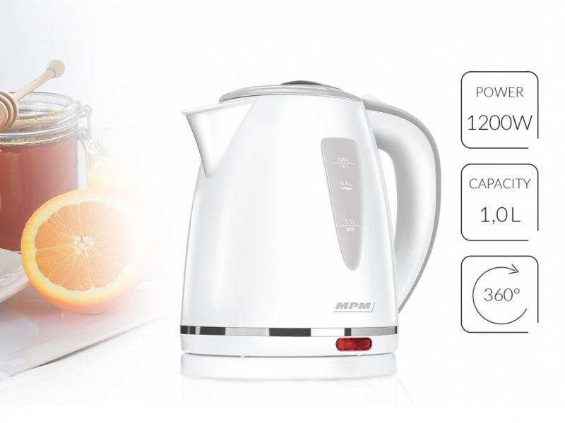 The MCZ-64 is a small electric kettle with a capacity of 1.0 liters. Thanks to the stable, rotating base, you can place it in any direction you want. The device has a convenient switch and easy opening of the cover, which effectively protects against accidental burns.