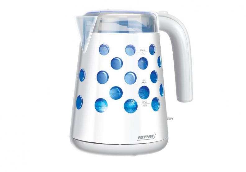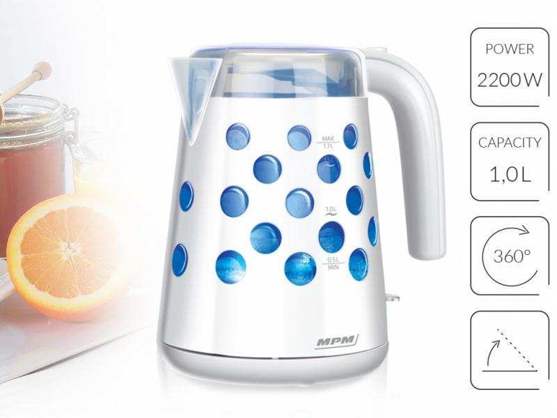 The MPM MCZ-86 kettle is distinguished by its distinctive design. The white casing, with small holes in the shape of a circle illuminated in blue during cooking, creates a unique, original combination.
