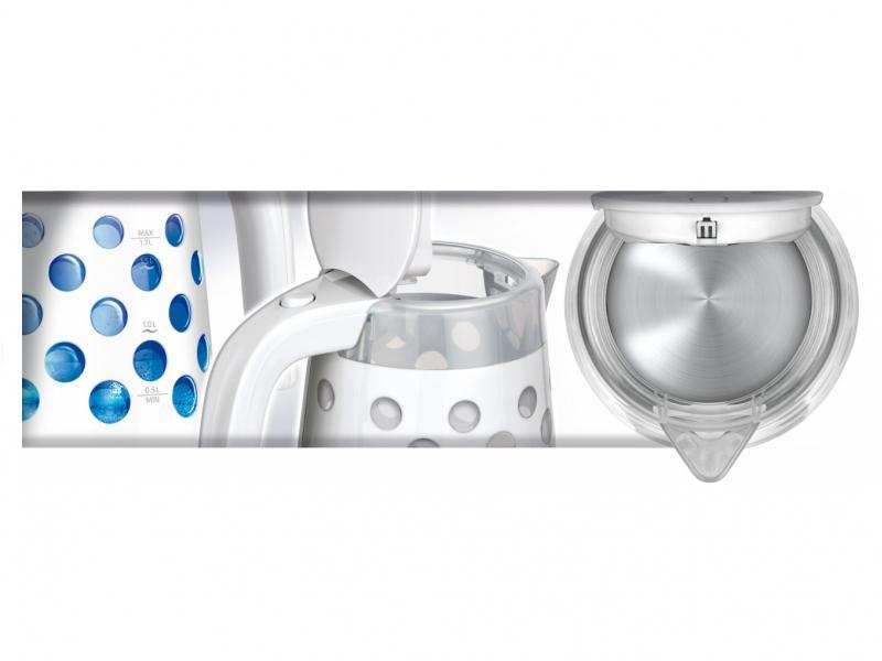 Illuminated interior of the kettle Multi-level security system Automatic lid Water level indicator with scale Stable 360° swivel base Covered heater Equipment Removable filter Capacity min/max 0,5/1,7l Power supply 220-240V, 50/60Hz Power 1850-2200W