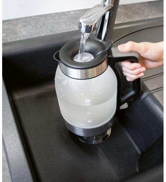 Satin glass/stainless steel housing Stainless steel base station with cable rewind 1.7 litre capacity One-hand operation - self-closing filling opening in the lid Easy handling due to cordless technology and 360° rotatable plug connection On/off switch (illuminated in blue) Water tank (illuminated in blue) Concealed stainless steel heating element Automatic and manual switch-off Water level indicator Water tank made of heat-resistant safety glass Dry-running/overheating protection 220-240V, 50/60Hz, 1850 - 2200W