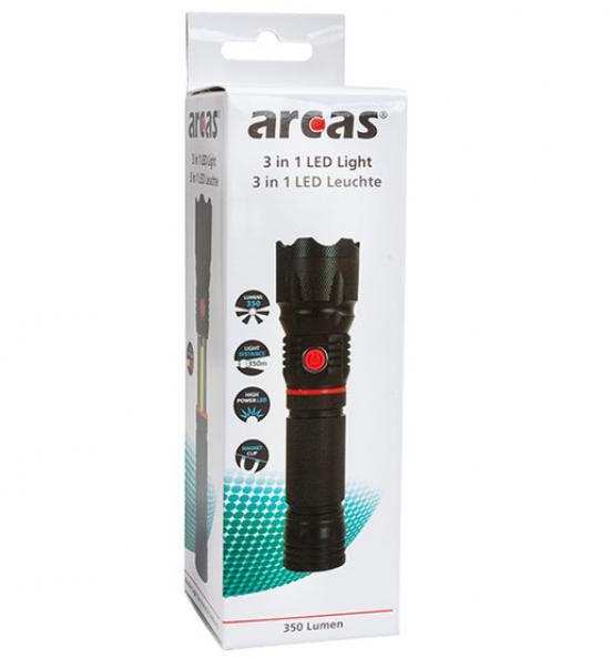 Arcas 307 00036. Flashlight type Hand flashlight, Product colour Black, Housing material Aluminum. Lamp type LED, Lamps quantity 2 lamp(s), Luminous flux 350 lm. Battery type AAA. Width 170 mm, Weight 237.5 g