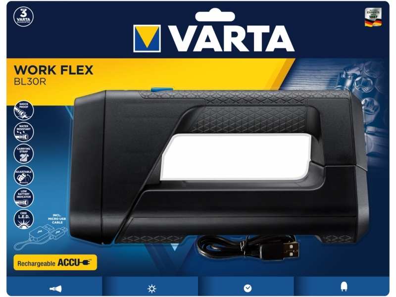 Varta Work Flex. Flashlight type Hand flashlight, Product colour Black, Control type Buttons. Lamp type LED, Luminous flux 600 lm. Battery technology Lithium-Ion (Li-Ion), Battery capacity 2600 mAh